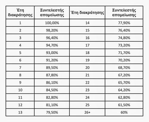 Η υπεραξία που προκύπτει σύμφωνα με τις ανωτέρω παραγράφους λαμβάνεται απομειούμενη με την εφαρμογή των ακόλουθων συντελεστών απομείωσης: